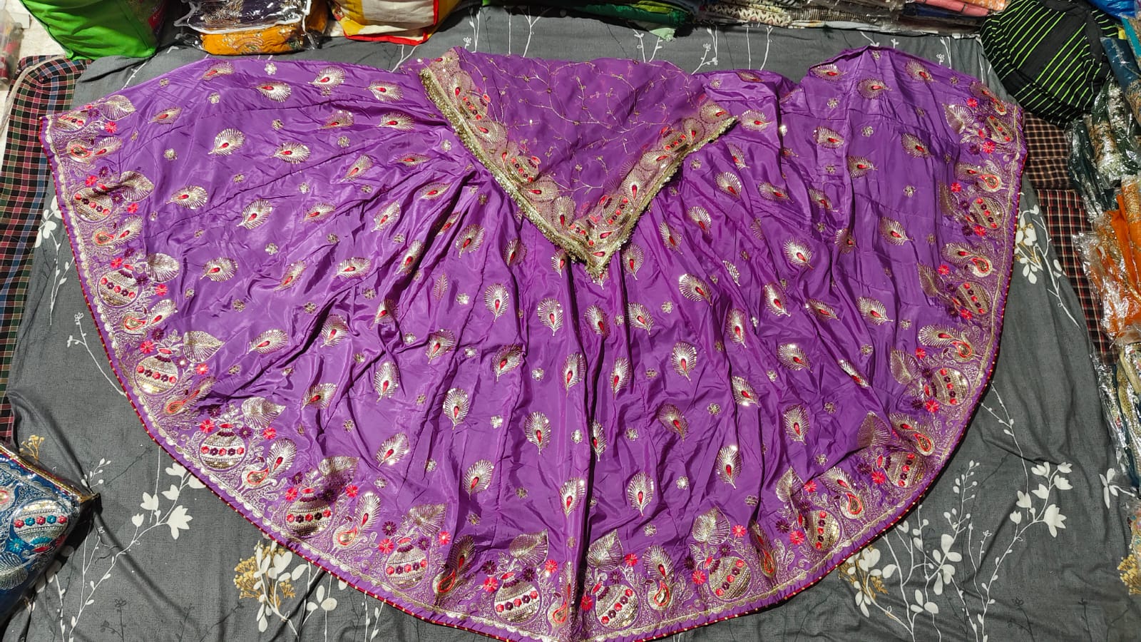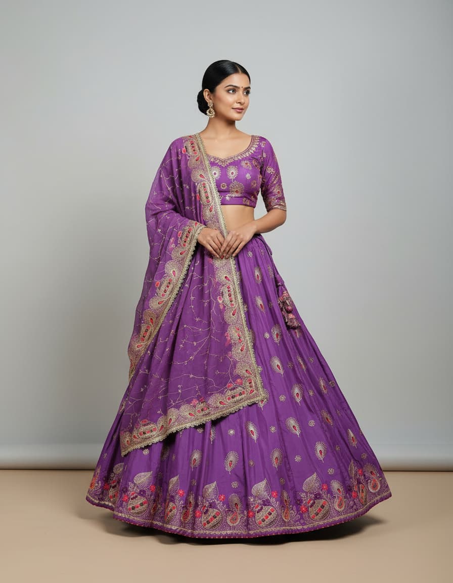 Lehenge ke *beech-beech mein mor pankh ka embroidery work* kiya gaya hai, jo is outfit ko ek alag hi classy aur traditional touch deta hai. Ye fine embroidery kaam is lehenga ko festive aur special occasions ke liye perfect banata hai.